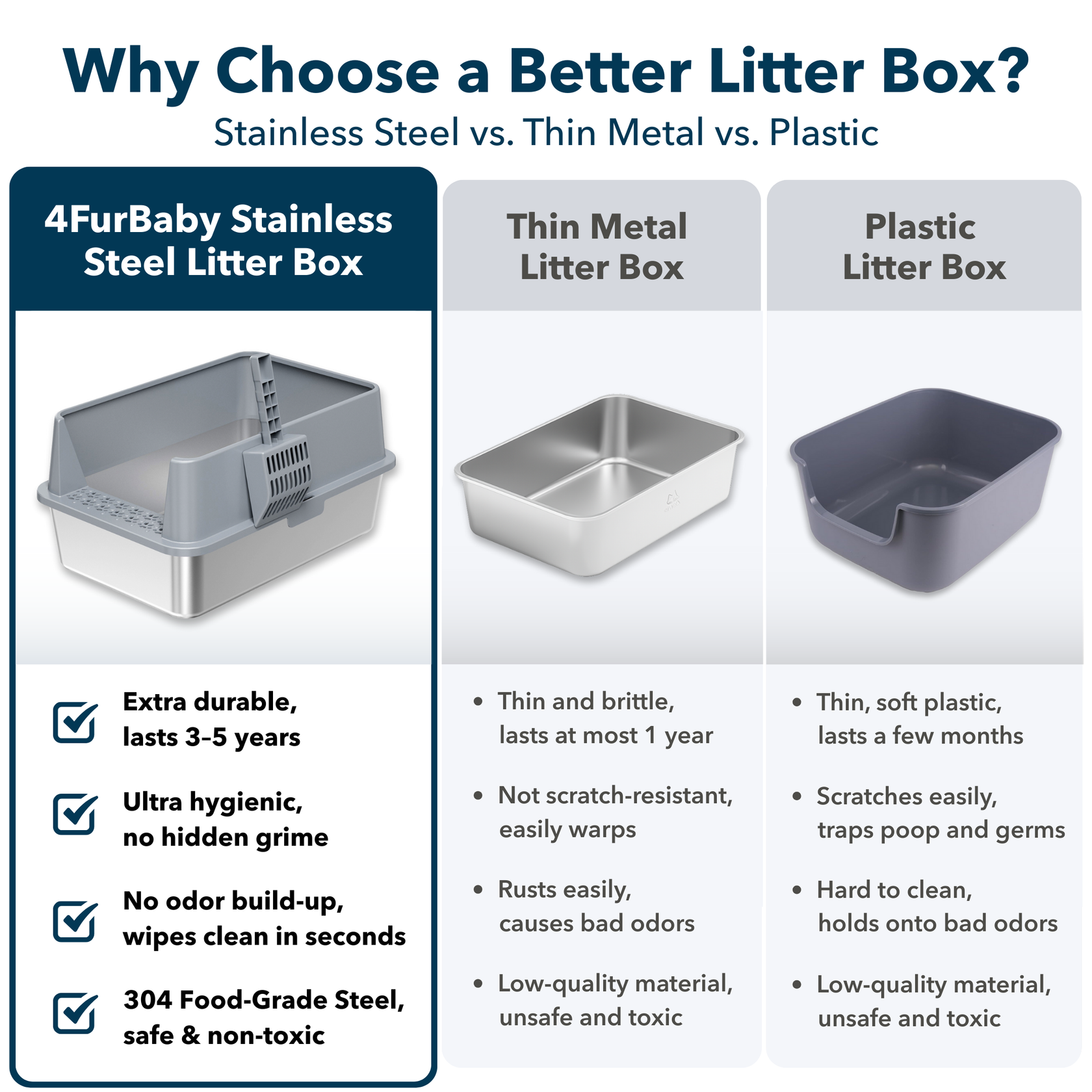 A: Stainless steel litter boxes offer superior durability, are easier to clean, don't retain odors, are scratch-resistant, and are more hygienic since the non-porous surface prevents bacteria growth. They're also more environmentally friendly due to their longevity.